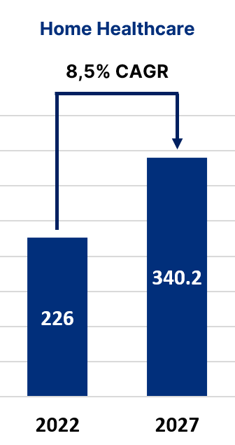 The global Home Healthcare market will grow 1.5 times by 2027 and reach 340.2 billion USD.