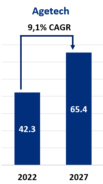 The global market for Agetech will grow 2.5 times and reach a market share of over 2 trillion USD.