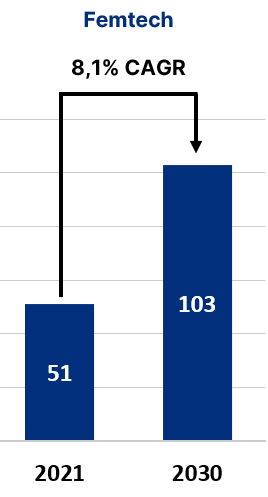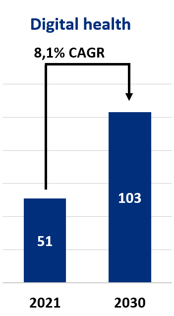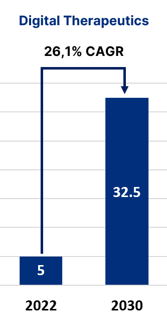 The global market for startups targeting digital and app-based therapies will grow 6.5 times by 2030 to reach 32.5 billion USD.